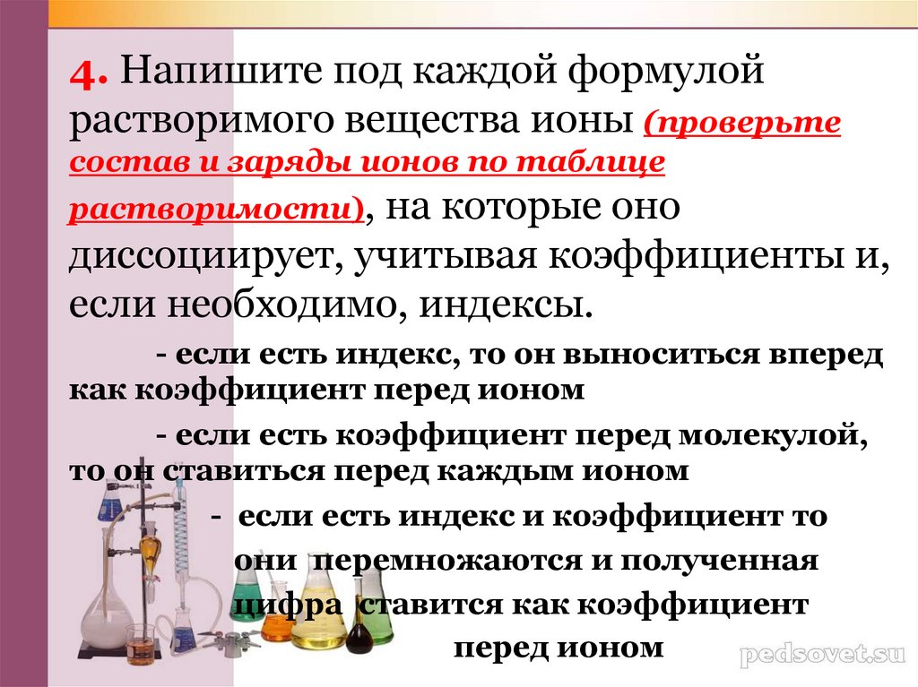4. Напишите под каждой формулойрастворимого вещества ионы (проверьте