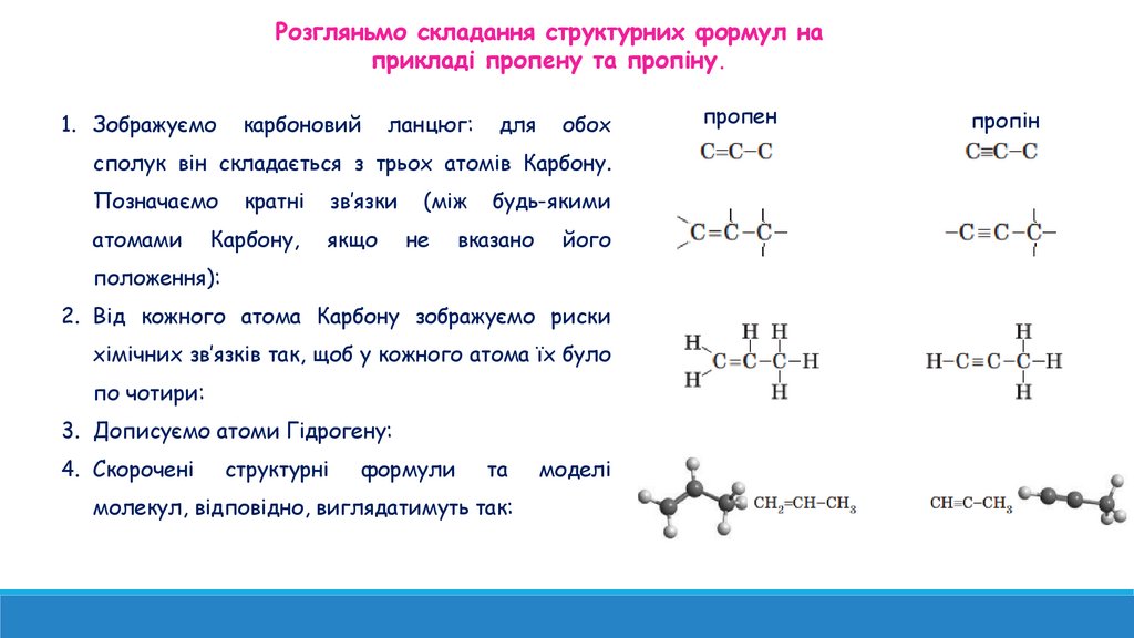 Розгляньмо складання структурних формул наприкладі пропену та пропіну.