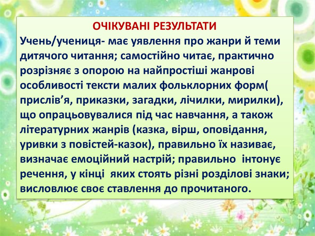 ОЧІКУВАНІ РЕЗУЛЬТАТИУчень/учениця- має уявлення про жанри й теми