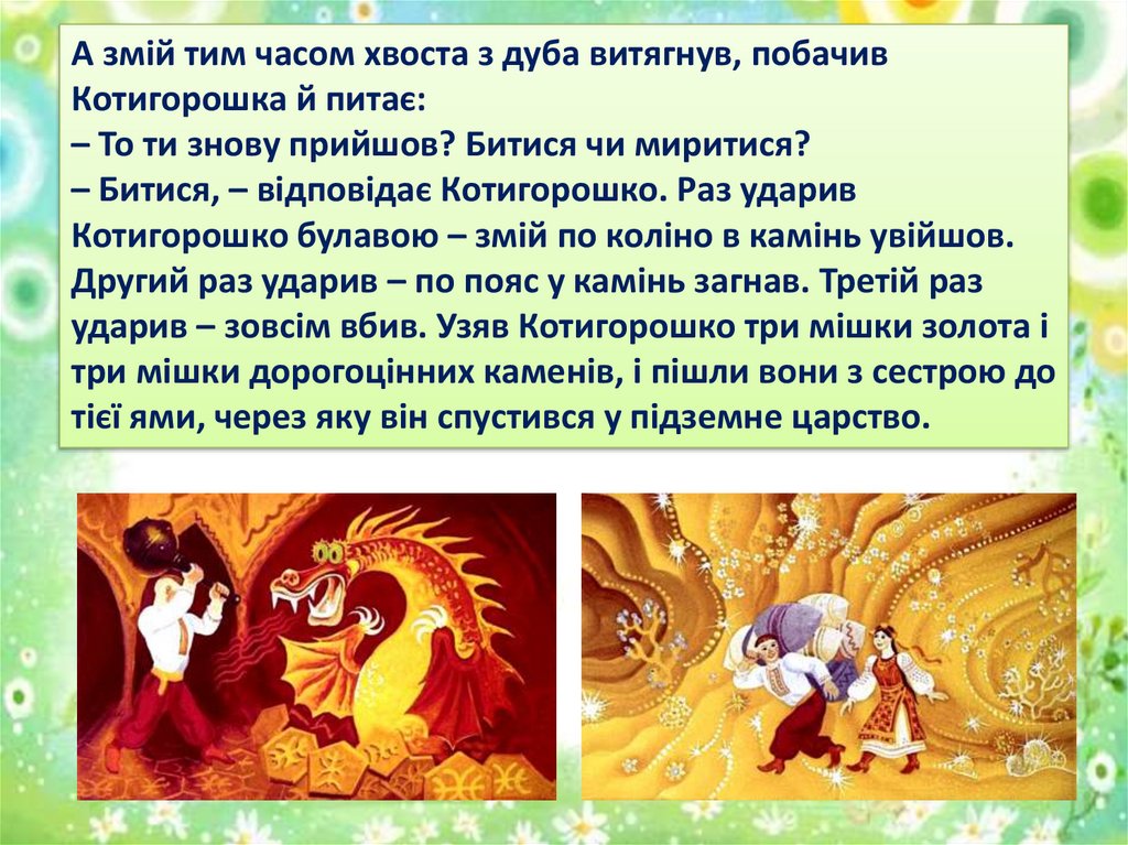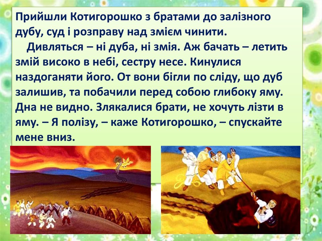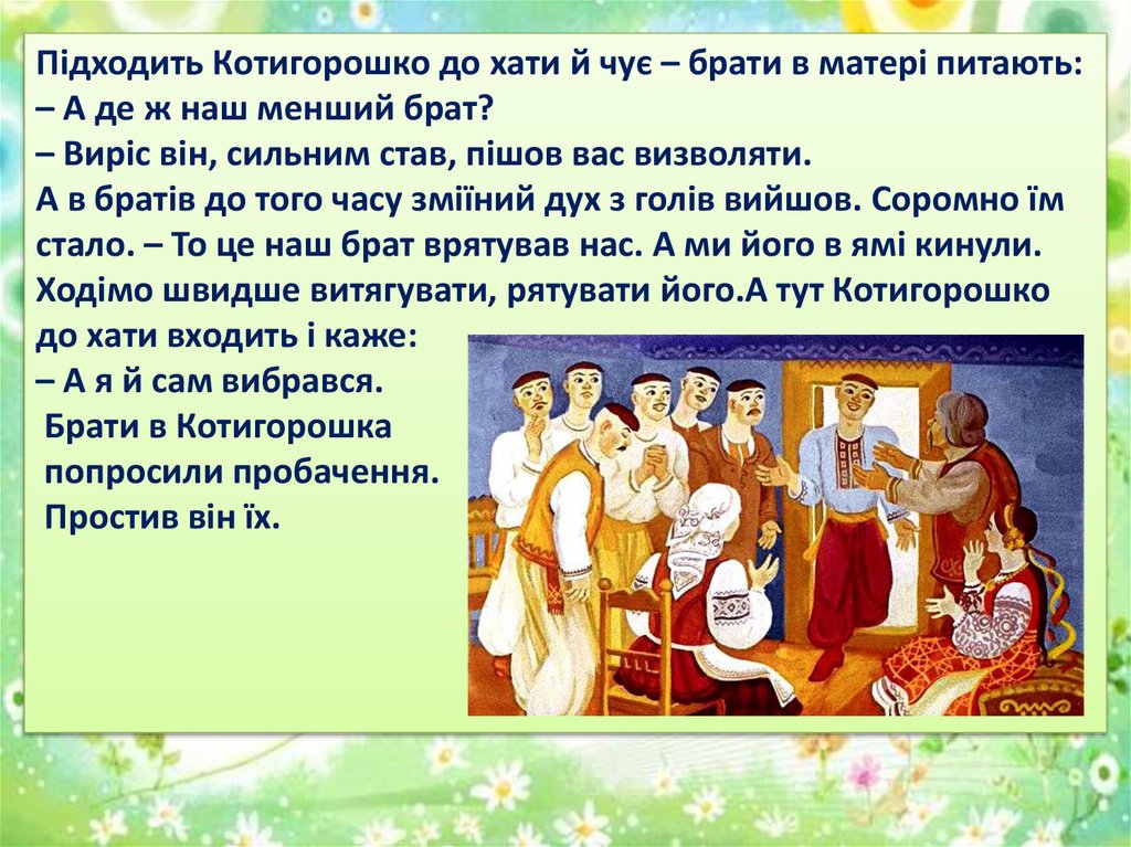 Підходить Котигорошко до хати й чує – брати в матері питають:– А де ж наш менший брат?