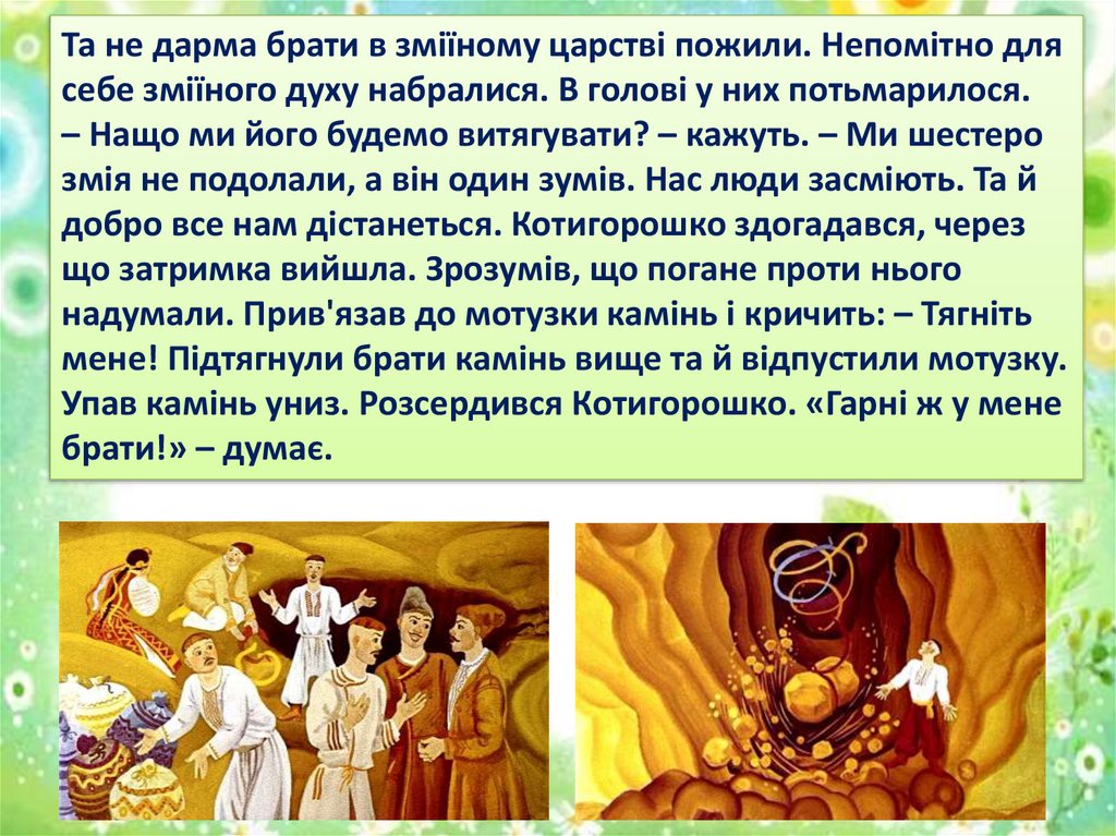 Прийшли. Котигорошко й кричить:– Гей, ви, добрі молодці! Мотузку опускайте, нас нагору