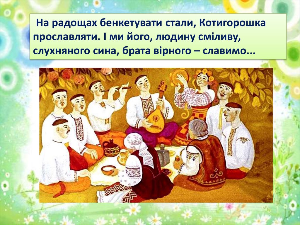 На радощах бенкетувати стали, Котигорошкапрославляти. І ми його, людину сміливу,
