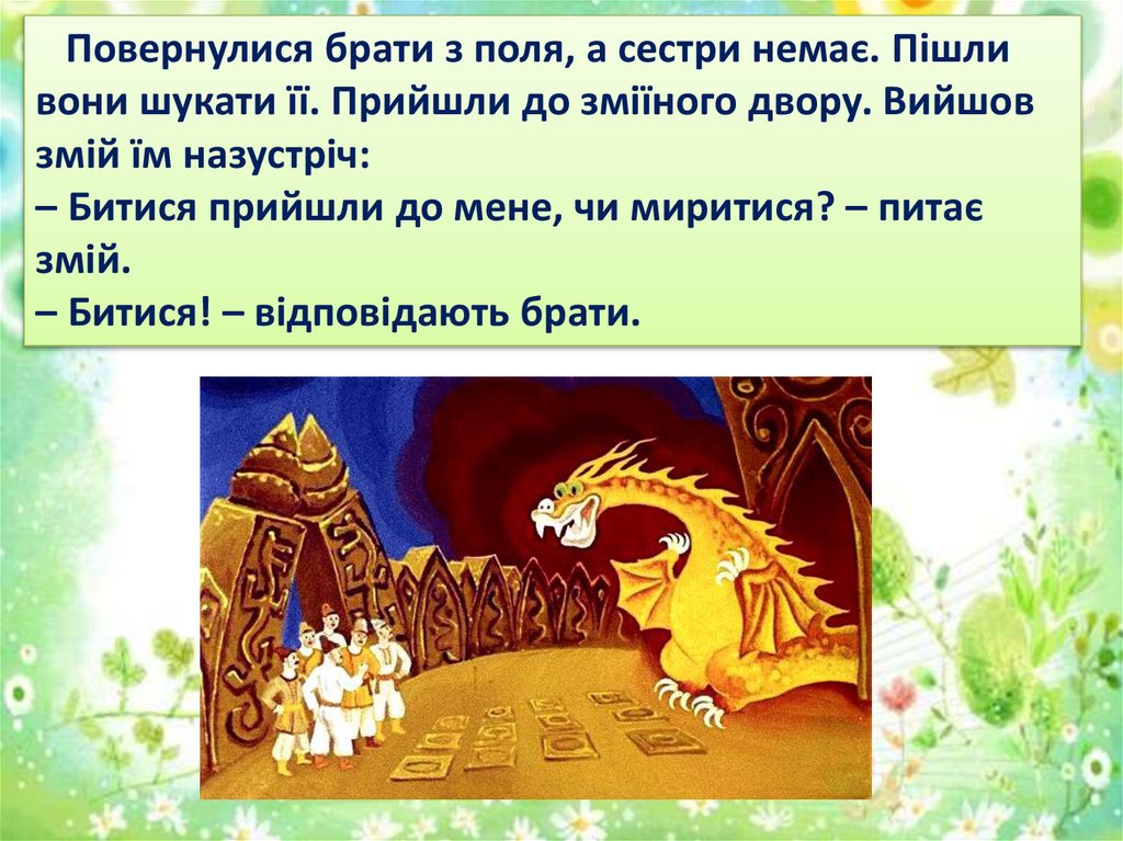 Повернулися брати з поля, а сестри немає. Пішливони шукати її. Прийшли до зміїного двору. Вийшов