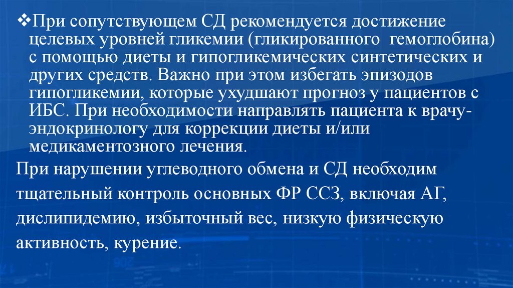 При сопутствующем СД рекомендуется достижениецелевых уровней гликемии (гликированного гемоглобина)