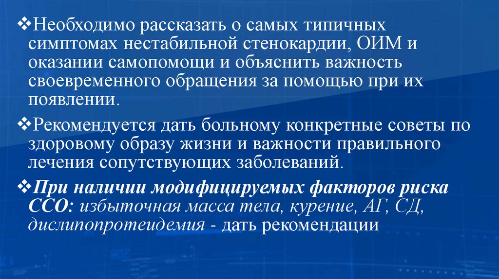 Необходимо рассказать о самых типичныхсимптомах нестабильной стенокардии, ОИМ и