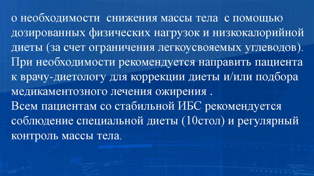 ИБС. При необходимости направлять пациента к врачуэндокринологу для коррекции диеты и/или