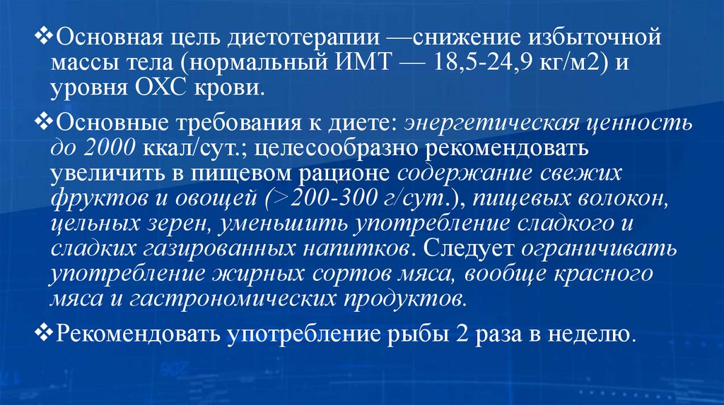 Основная цель диетотерапии —снижение избыточноймассы тела (нормальный ИМТ — 18,5-24,9 кг/м2) и
