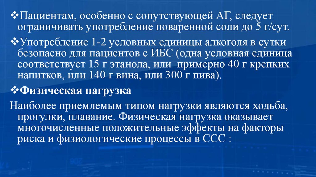 Пациентам, особенно с сопутствующей АГ, следуетограничивать употребление поваренной соли до 5 г/сут.