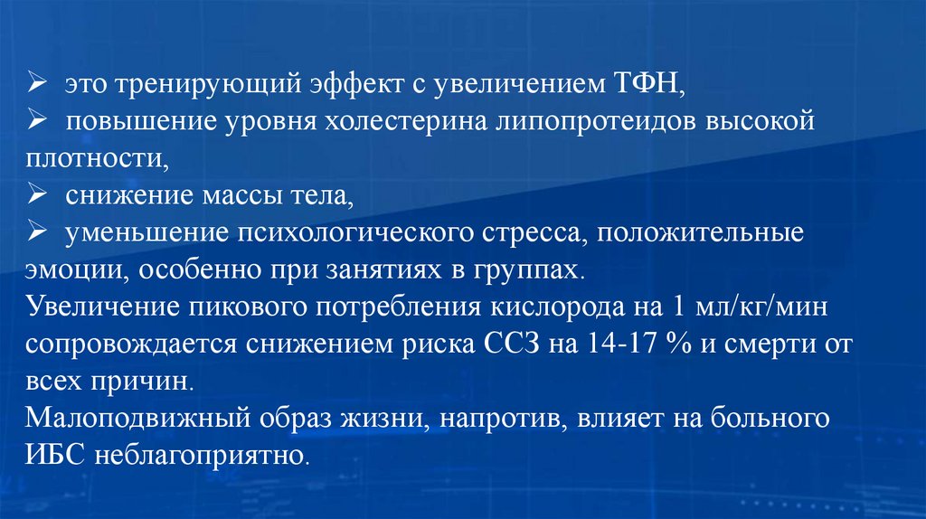это тренирующий эффект с увеличением ТФН,повышение уровня холестерина липопротеидов высокой