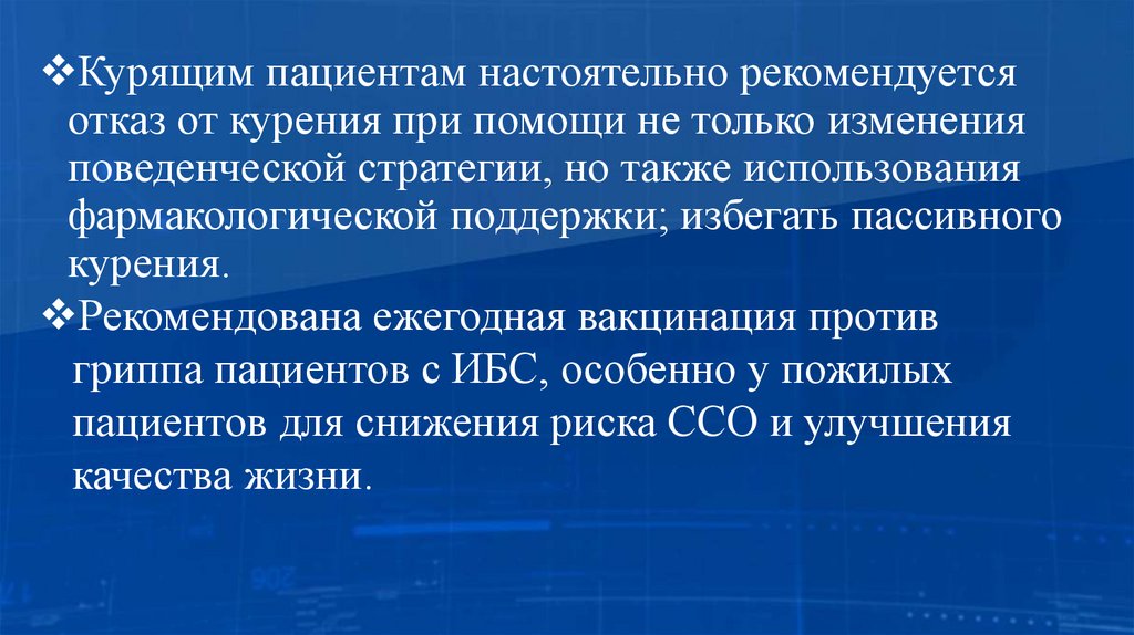 Курящим пациентам настоятельно рекомендуетсяотказ от курения при помощи не только изменения