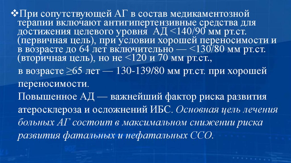 При сопутствующей АГ в состав медикаментознойтерапии включают антигипертензивные средства для