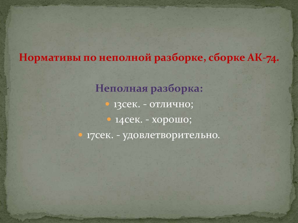 Нормативы по неполной разборке, сборке АК-74.Неполная разборка: