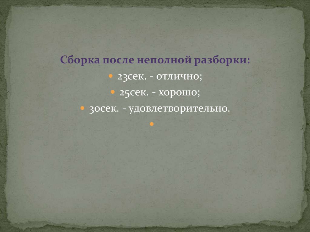 Сборка после неполной разборки:23сек. - отлично;