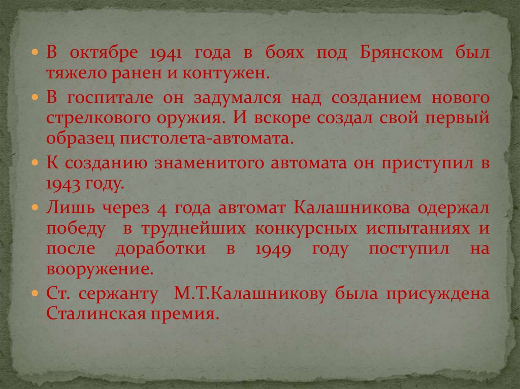 Ст. сержанту М.Т.Калашникову была присуждена