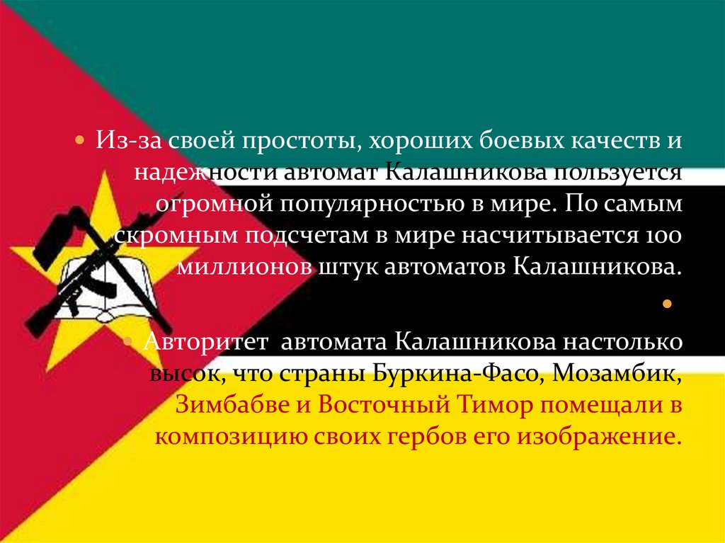 Из-за своей простоты, хороших боевых качеств инадежности автомат Калашникова пользуется