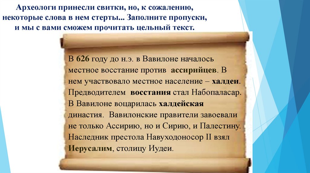 Археологи принесли свитки, но, к сожалению,некоторые слова в нем стерты... Заполните пропуски,
