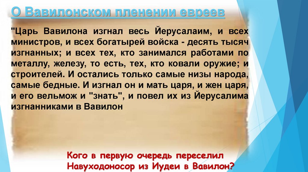 О Вавилонском пленении евреев"Царь Вавилона изгнал весь Йерусалаим, и всех