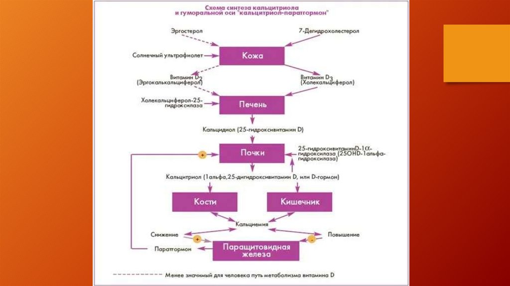 • Уровень активных метаболитов витамина Д регулируется уровнемкальция и фосфора в сыворотке крови: низкие уровни кальция и