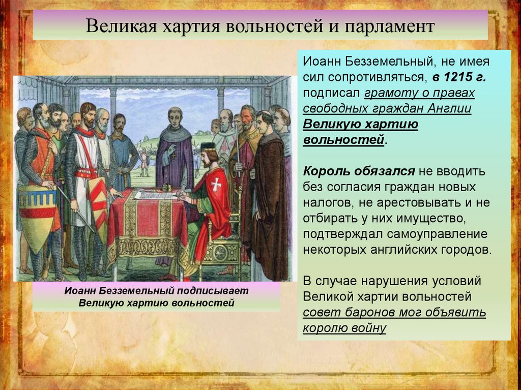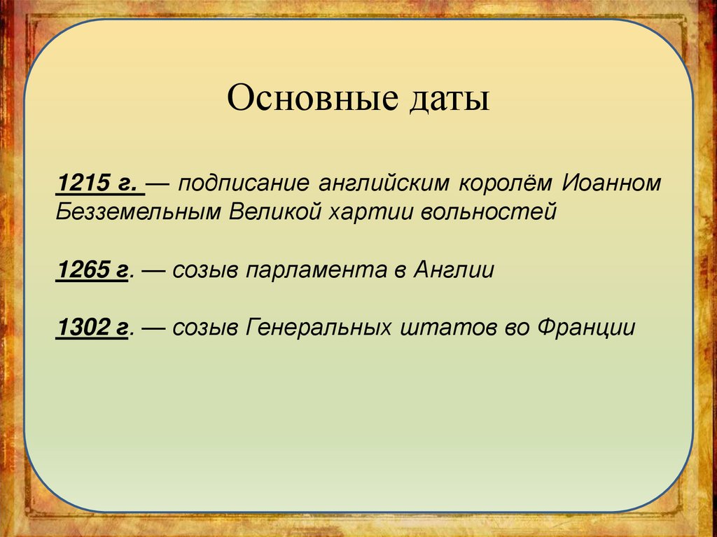 Основные даты1215 г. — подписание английским королём Иоанном