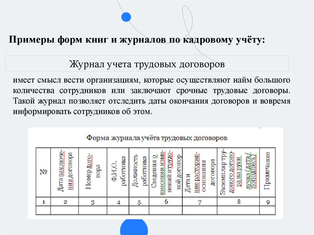 Примеры форм книг и журналов по кадровому учёту:Журнал учета трудовых договоров