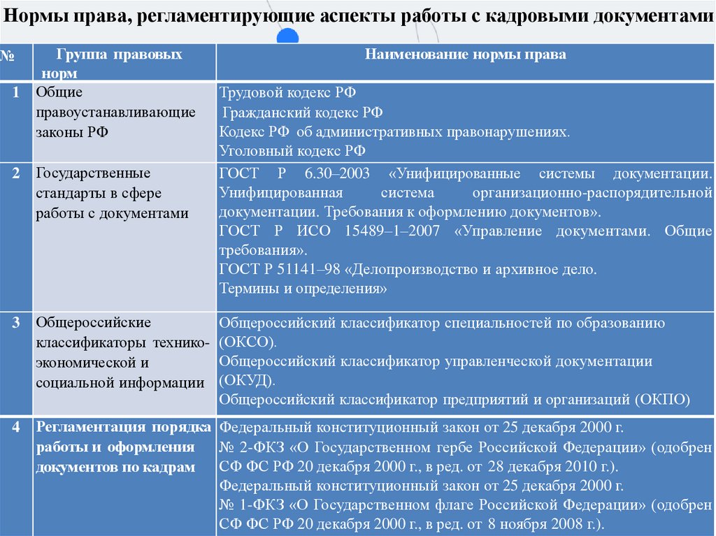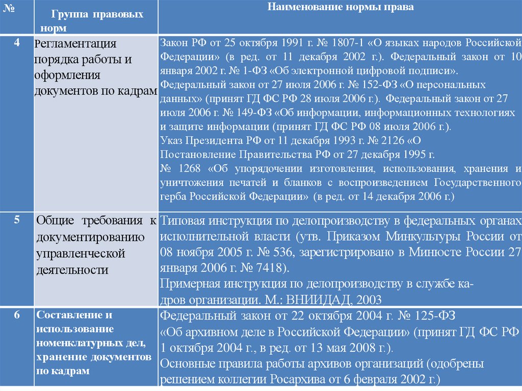 Нормы права, регламентирующие аспекты работы с кадровыми документамиГруппа правовых