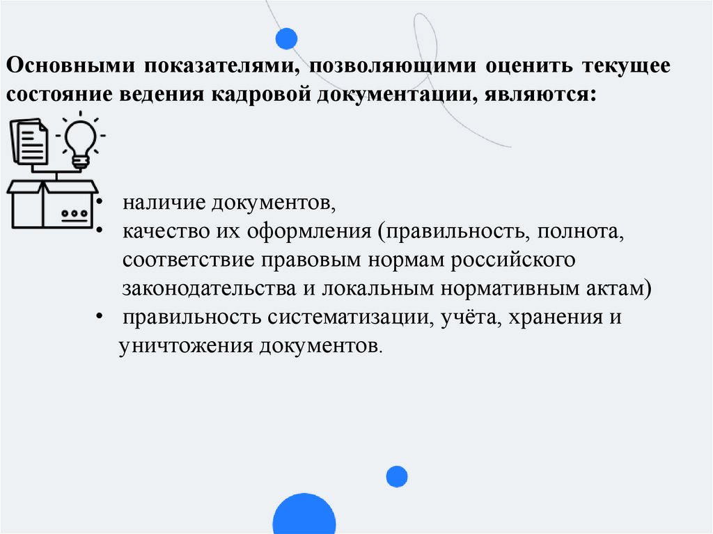 Основными показателями, позволяющими оценить текущеесостояние ведения кадровой документации, являются: