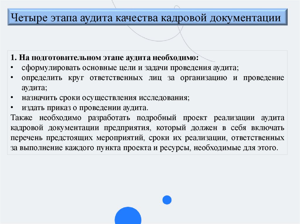 Четыре этапа аудита качества кадровой документации1. На подготовительном этапе аудита необходимо: