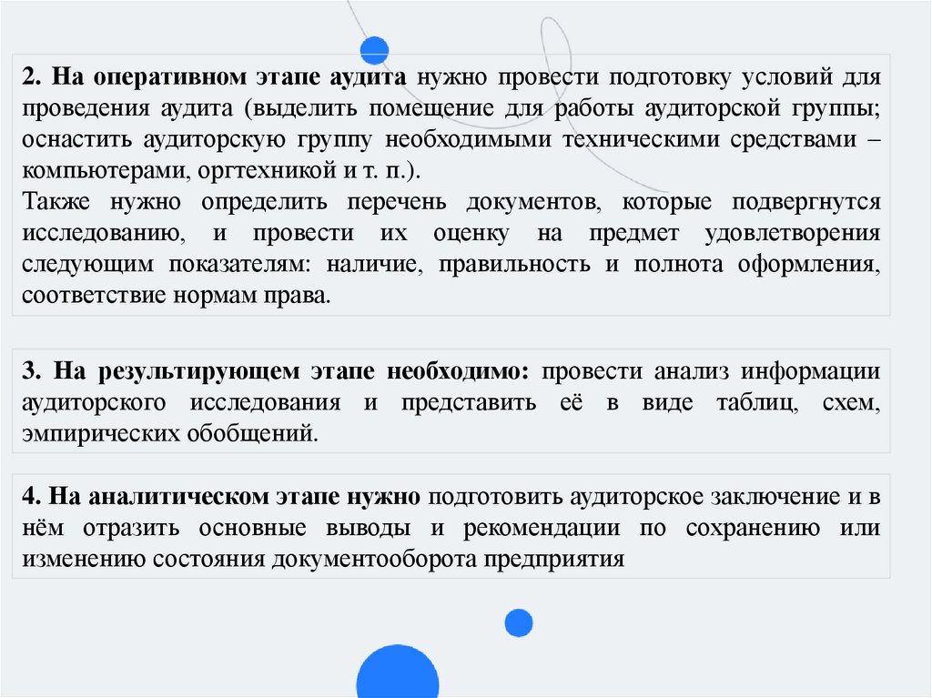 2. На оперативном этапе аудита нужно провести подготовку условий дляпроведения аудита (выделить помещение для работы аудиторской группы;