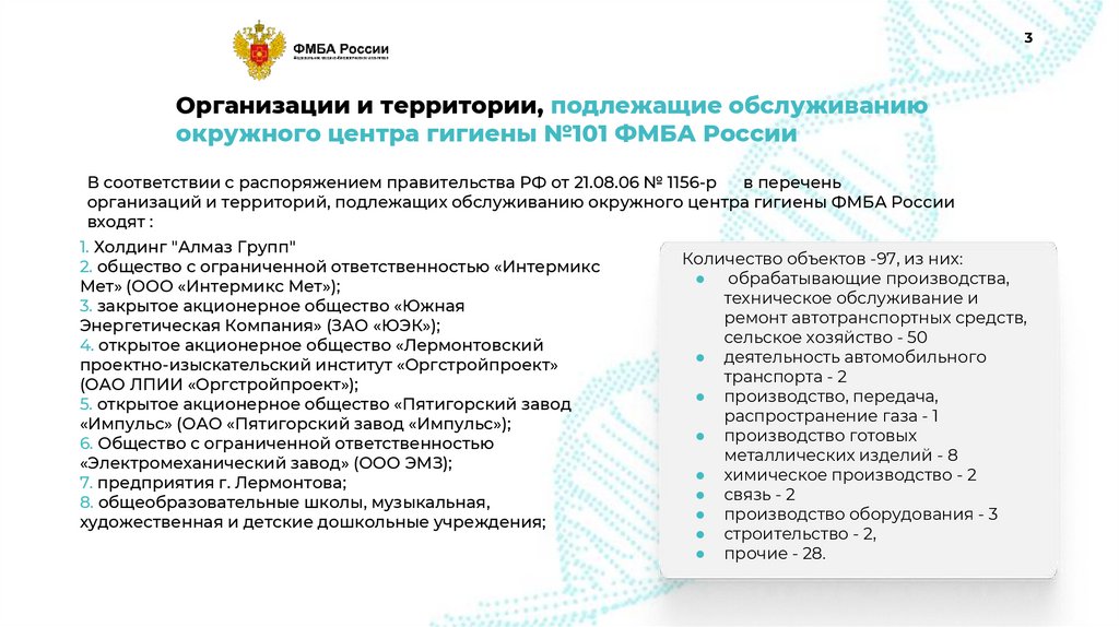 организаций и территорий, подлежащих обслуживанию окружного центра гигиены ФМБА России