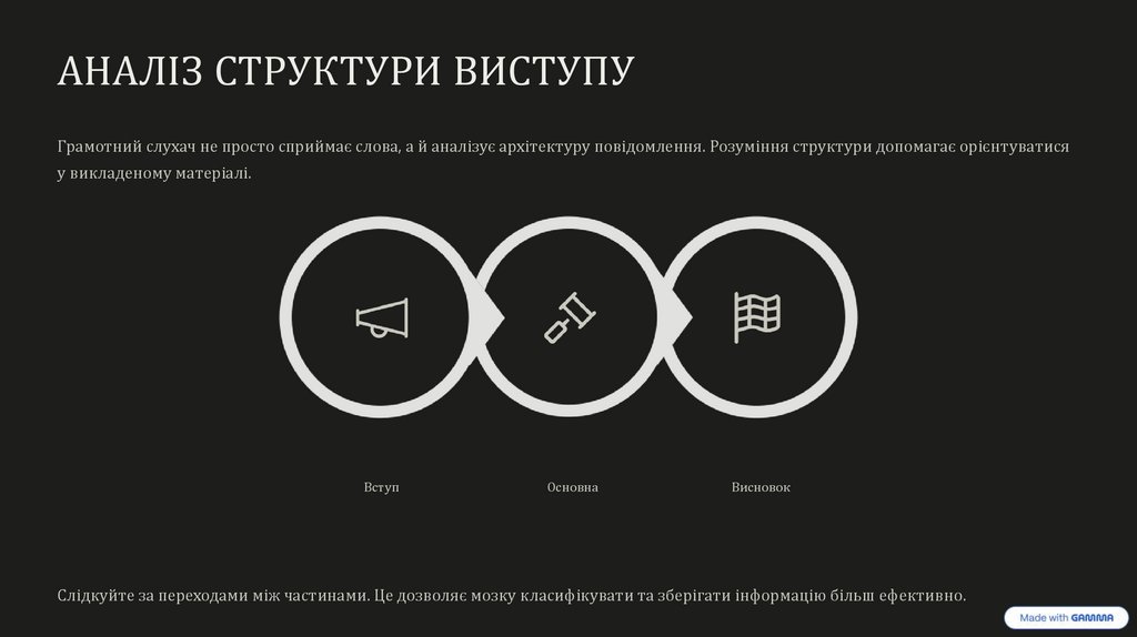 АНАЛІЗ СТРУКТУРИ ВИСТУПУГрамотний слухач не просто сприймає слова, а й аналізує архітектуру повідомлення. Розуміння структури допомагає орієнтуватися