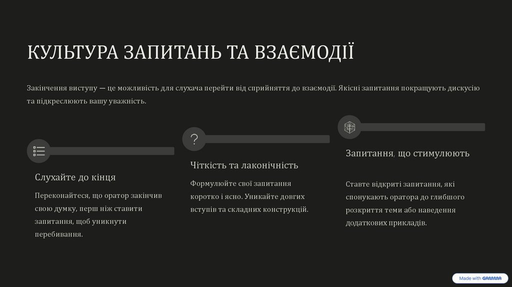 КУЛЬТУРА ЗАПИТАНЬ ТА ВЗАЄМОДІЇЗакінчення виступу — це можливість для слухача перейти від сприйняття до взаємодії. Якісні запитання покращують дискусію