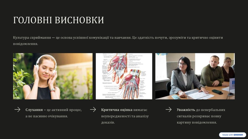 ГОЛОВНІ ВИСНОВКИКультура сприймання — це основа успішної комунікації та навчання. Це здатність почути, зрозуміти та критично оцінити