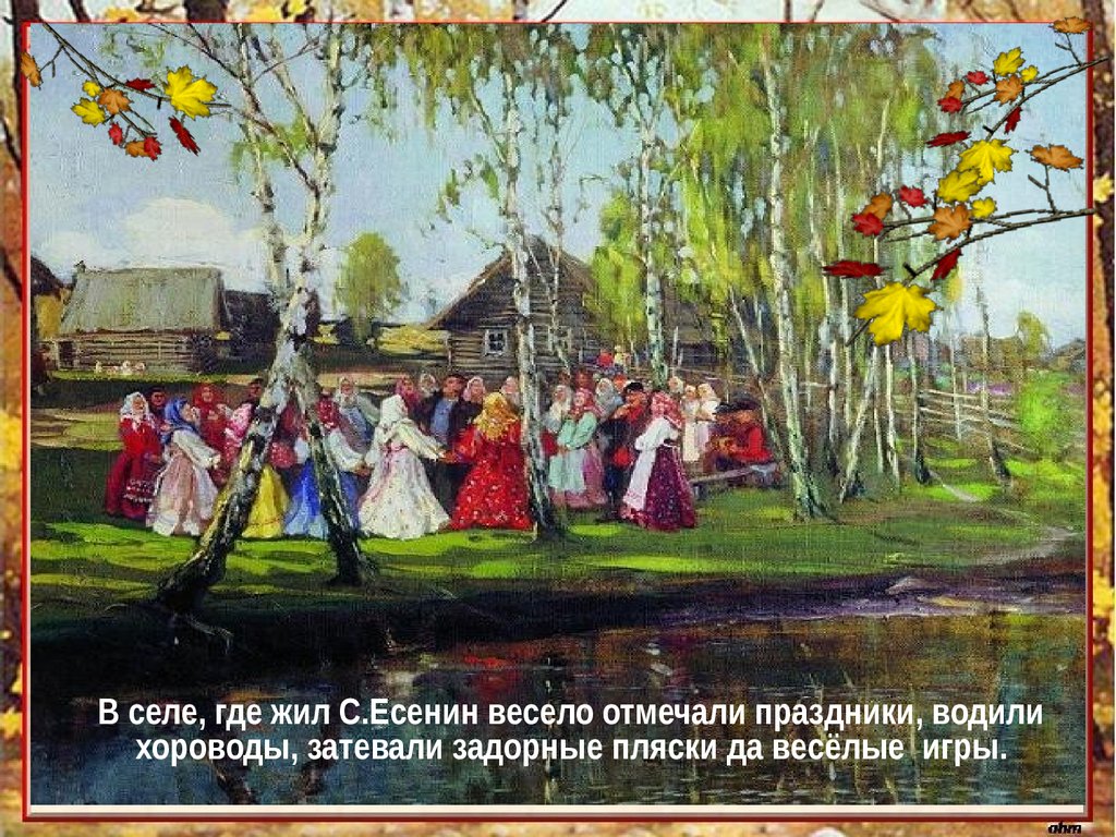 В селе, где жил С.Есенин весело отмечали праздники, водилихороводы, затевали задорные пляски да весёлые игры.