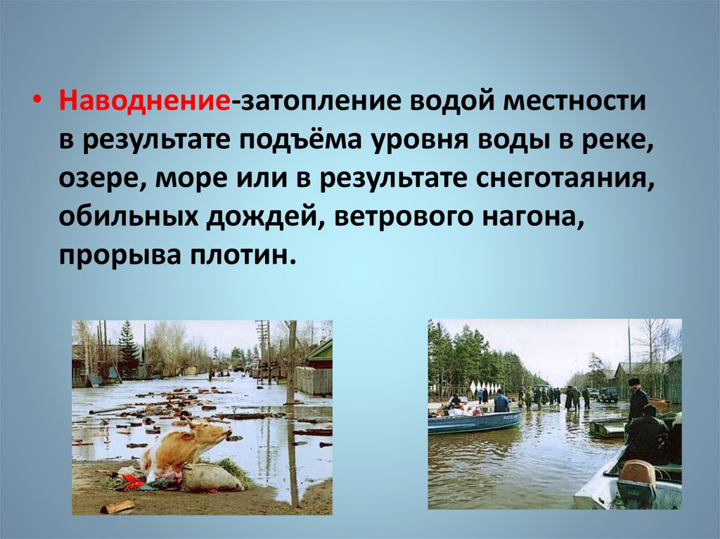 • Наводнение-затопление водой местностив результате подъёма уровня воды в реке,