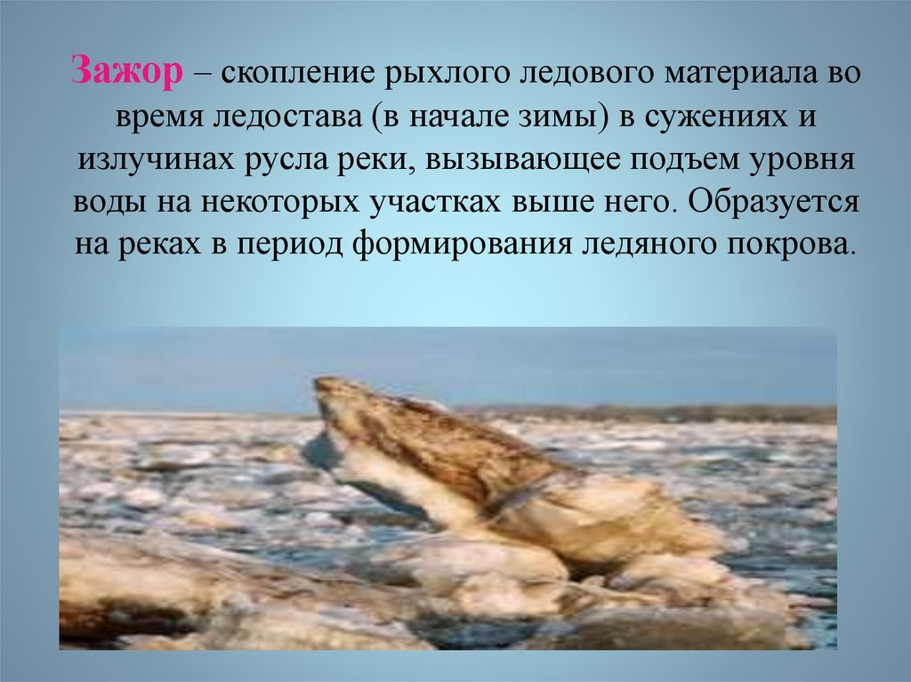 Зажор – скопление рыхлого ледового материала вовремя ледостава (в начале зимы) в сужениях и