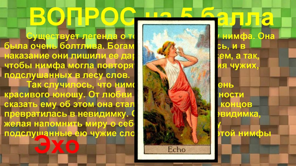 ВОПРОС на 5 баллаСуществует легенда о том, как жила в лесу нимфа. Она