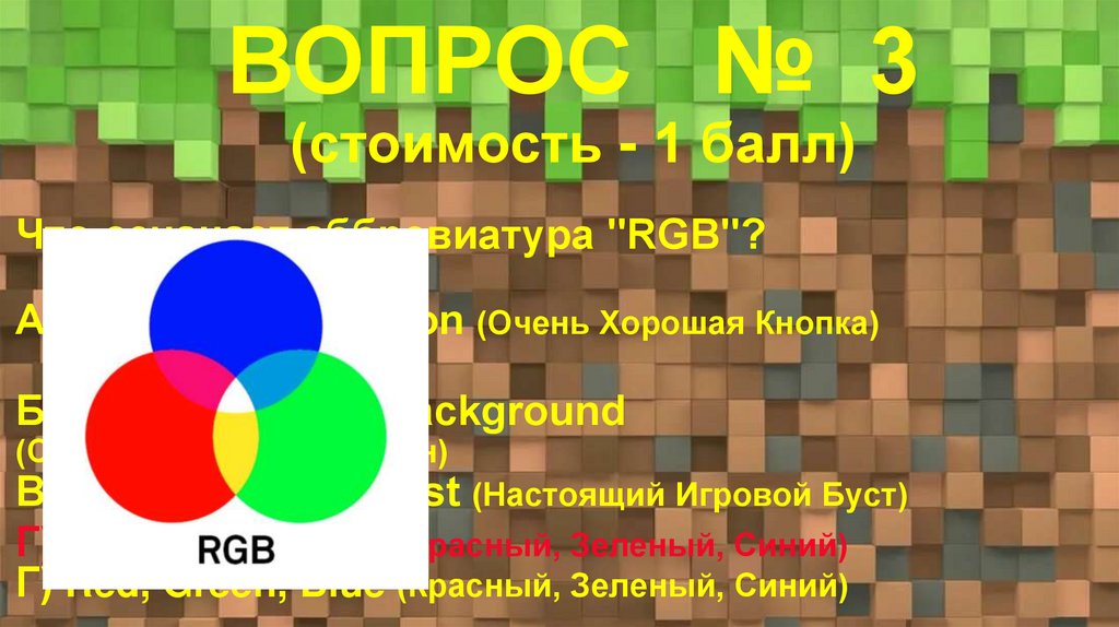 Г) Red, Green, Blue (Красный, Зеленый, Синий)