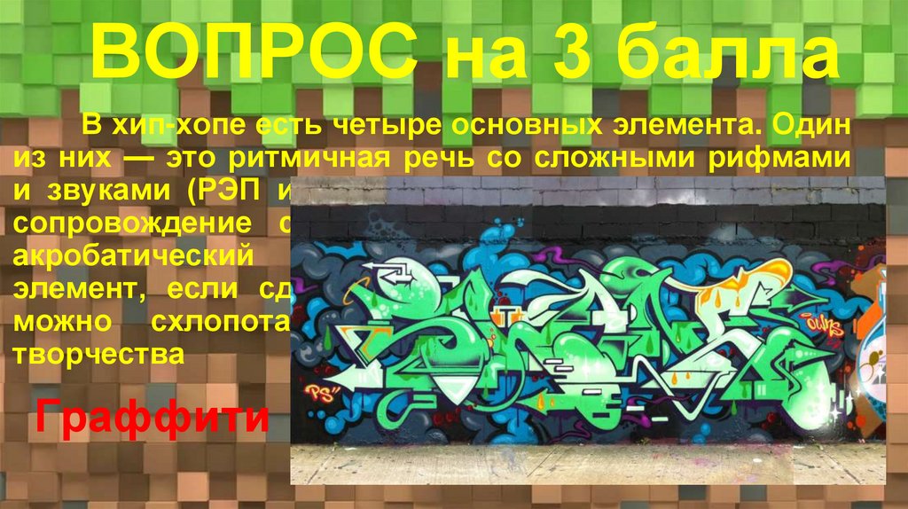 ВОПРОС на 3 баллаВ хип-хопе есть четыре основных элемента. Один