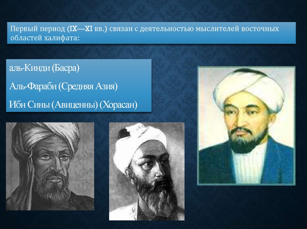 Первый период (IX—XI вв.) связан с деятельностью мыслителей восточныхобластей халифата: