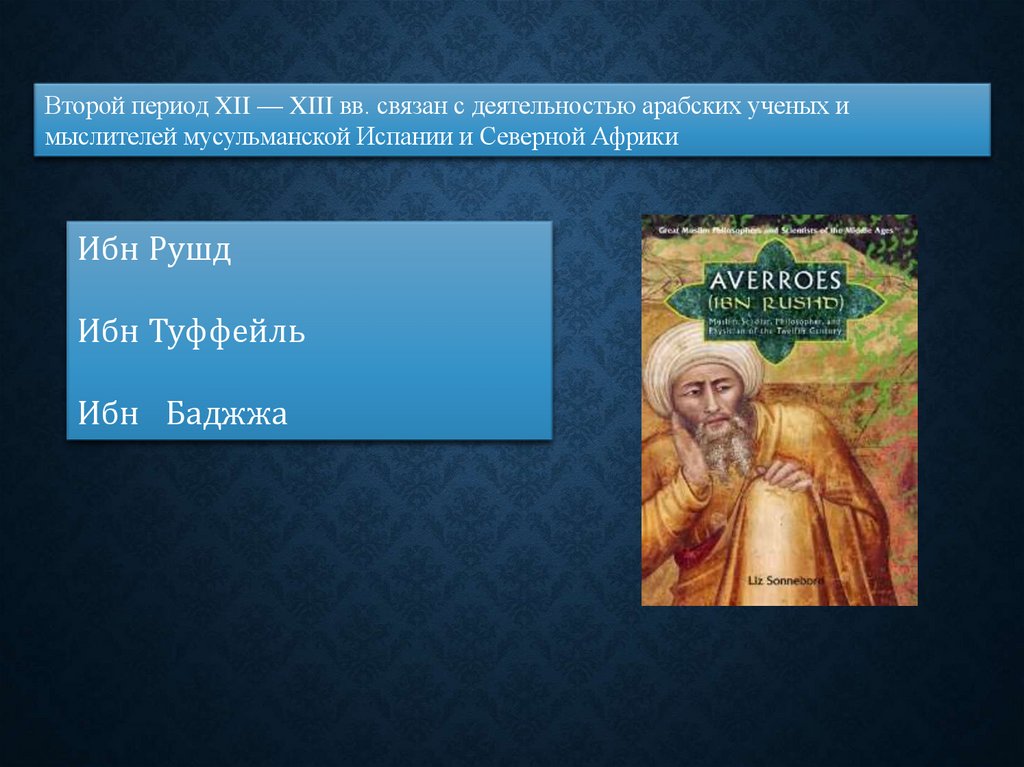 Второй период XII — XIII вв. связан с деятельностью арабских ученых имыслителей мусульманской Испании и Северной Африки