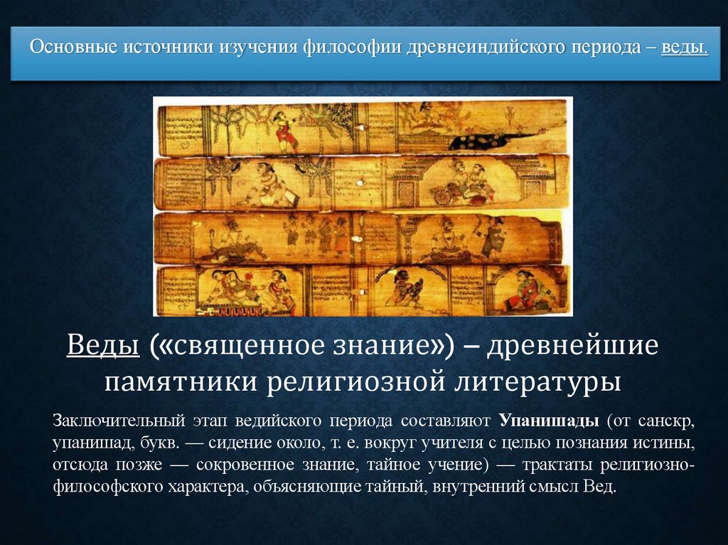 Основные источники изучения философии древнеиндийского периода – веды.Веды («священное знание») – древнейшие