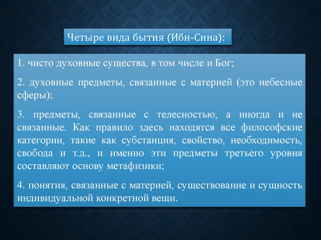 Четыре вида бытия (Ибн-Сина):1. чисто духовные существа, в том числе и Бог;