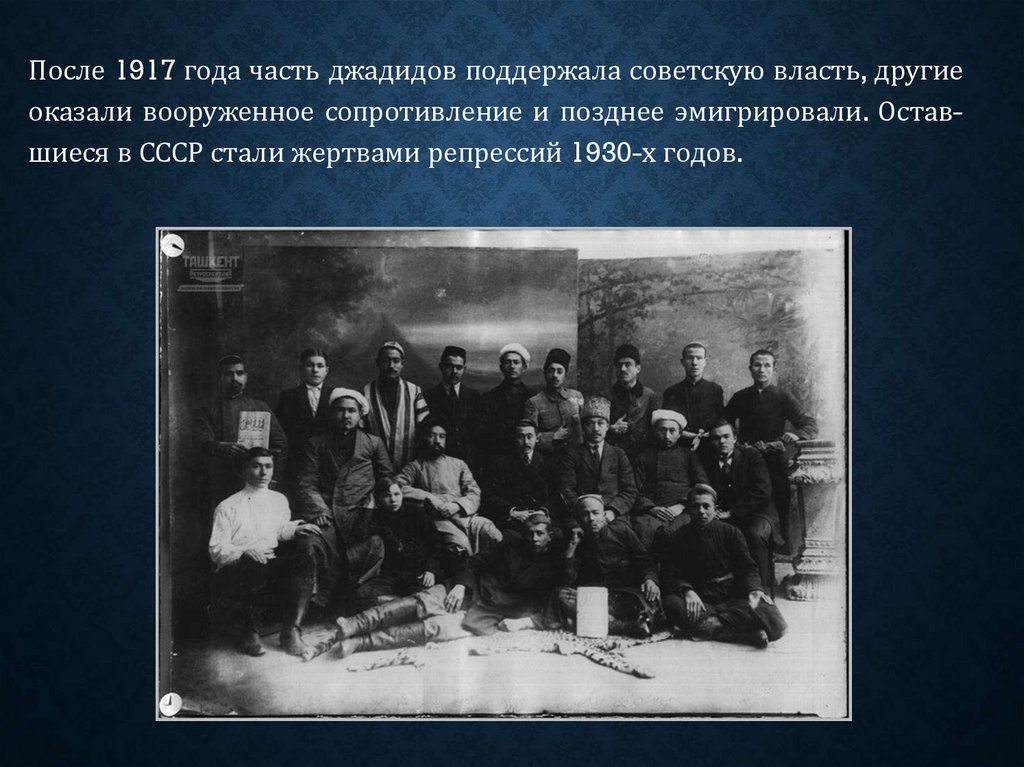 После 1917 года часть джадидов поддержала советскую власть, другиеоказали вооруженное сопротивление и позднее эмигрировали. Оставшиеся в СССР стали жертвами репрессий 1930-х годов.