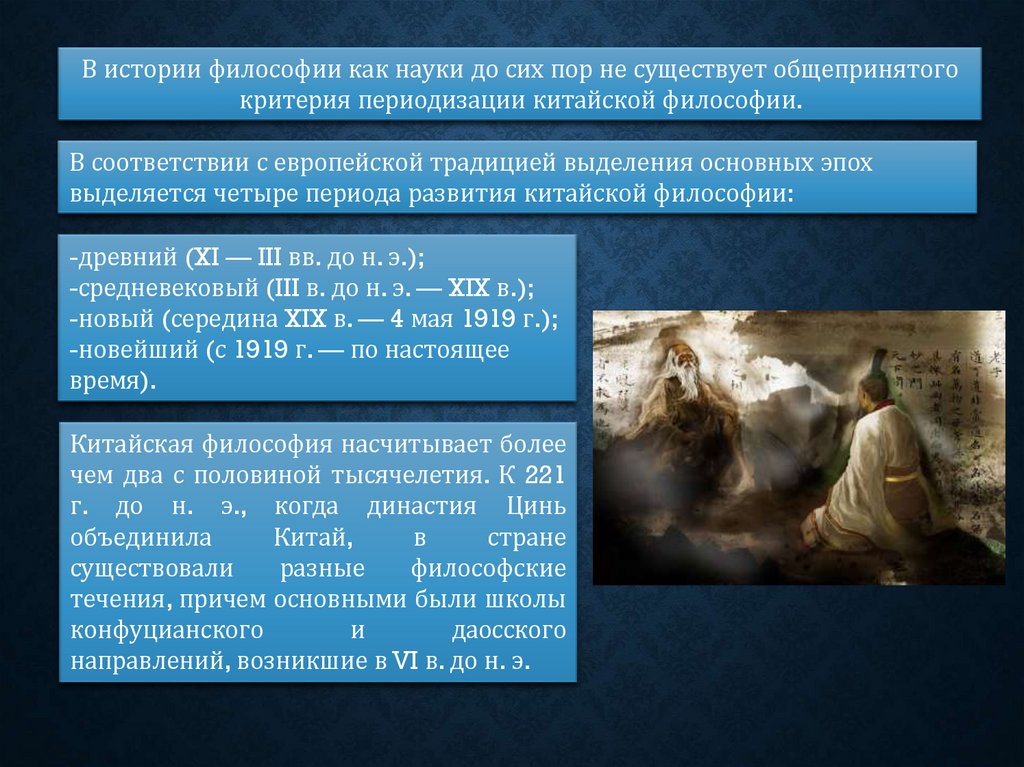 В истории философии как науки до сих пор не существует общепринятогокритерия периодизации китайской философии.