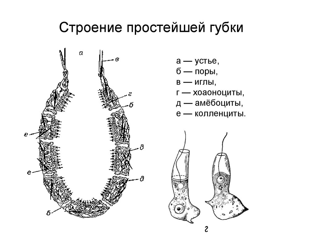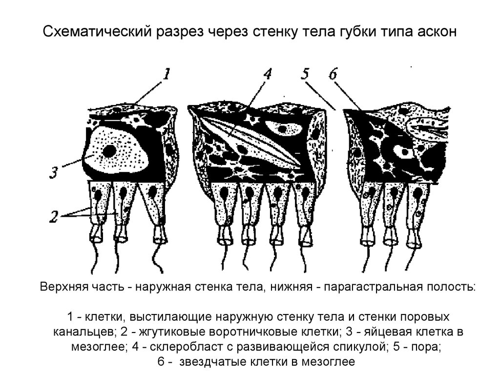 Схематический разрез через стенку тела губки типа асконВерхняя часть - наружная стенка тела, нижняя - парагастральная полость: