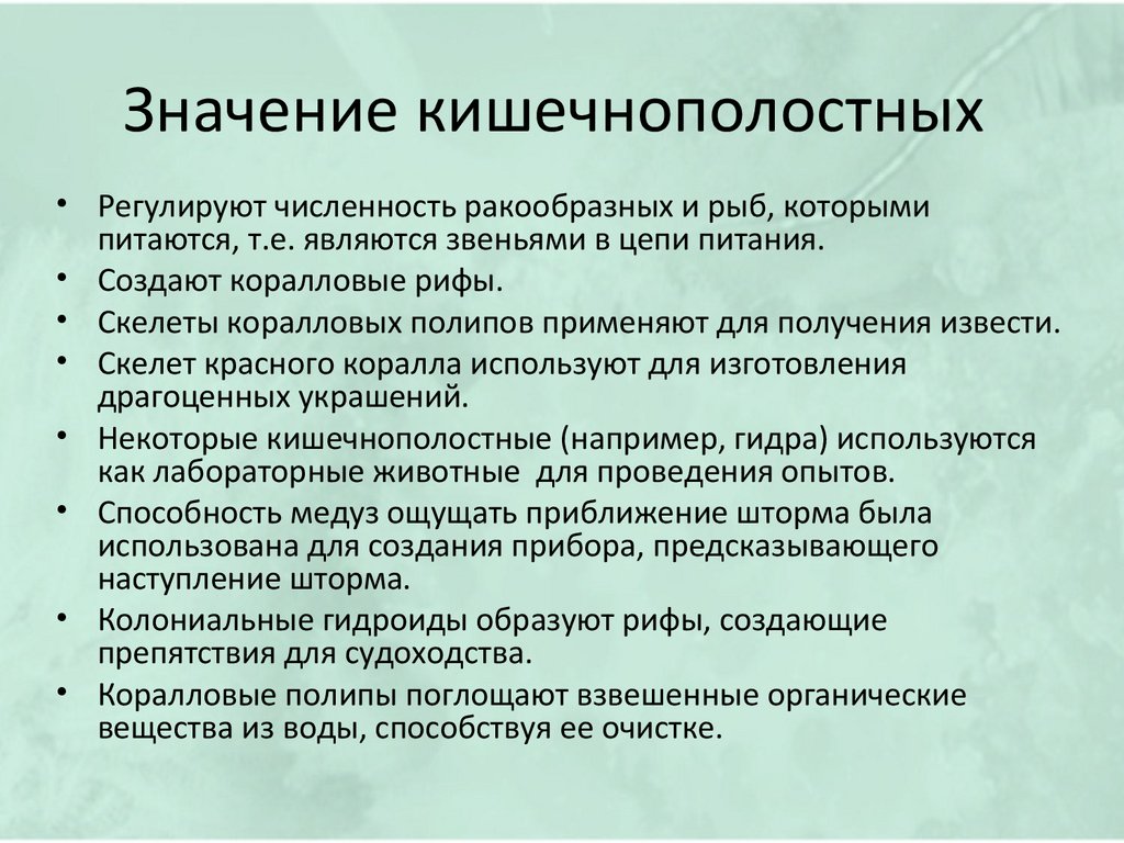 Значение кишечнополостных• Регулируют численность ракообразных и рыб, которыми