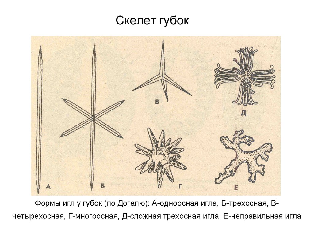 Скелет губокФормы игл у губок (по Догелю): А-одноосная игла, Б-трехосная, Вчетырехосная, Г-многоосная, Д-сложная трехосная игла, Е-неправильная игла