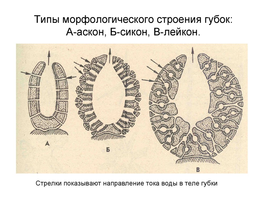 Типы морфологического строения губок:А-аскон, Б-сикон, В-лейкон.