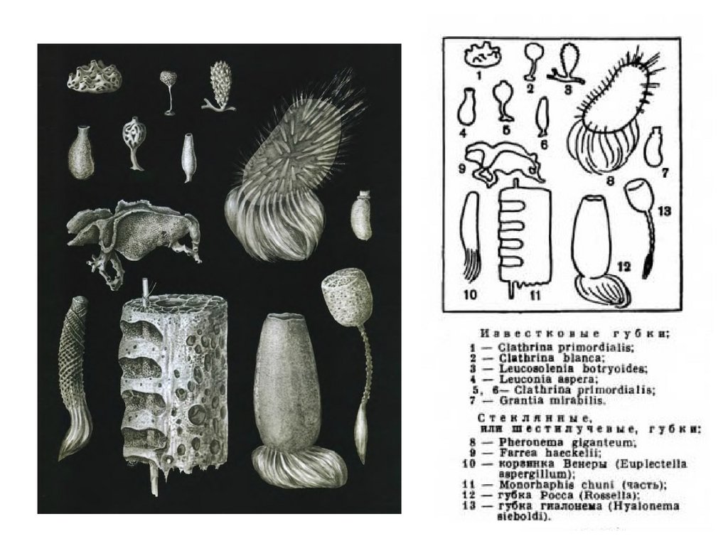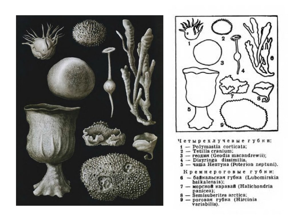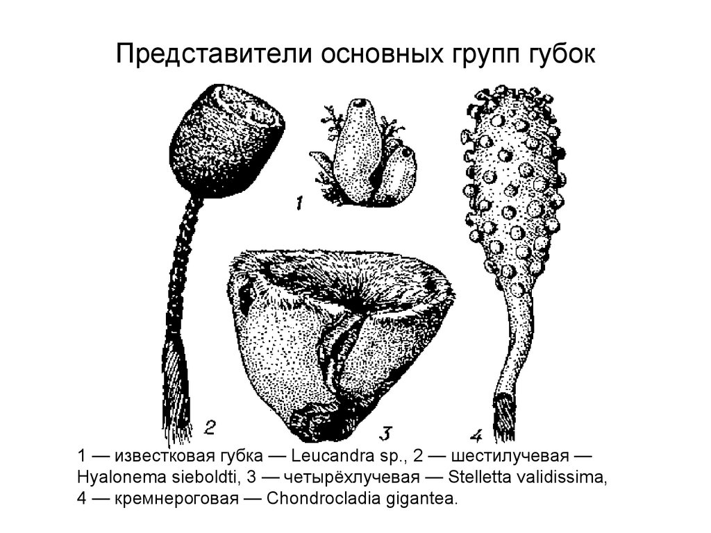 Представители основных групп губок1 — известковая губка — Leucandra sp., 2 — шестилучевая —