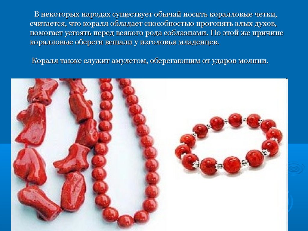 В некоторых народах существует обычай носить коралловые четки,считается, что коралл обладает способностью прогонять злых духов,